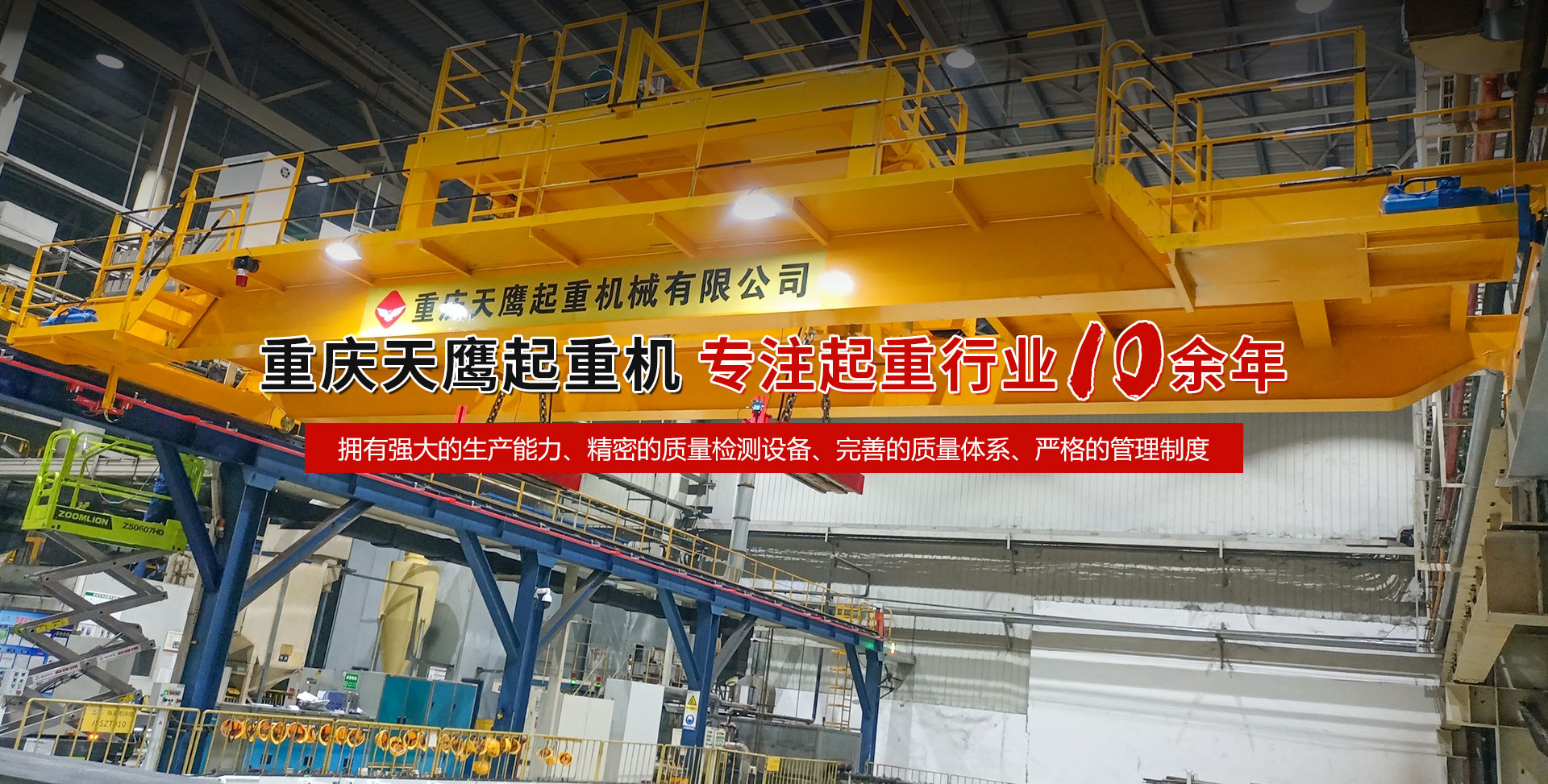 重慶天鷹起重機(jī)械有限公司成立于2014年,主營(yíng)起重機(jī)的銷售、安裝和維護(hù)等相關(guān)服務(wù)。中國(guó)重型機(jī)械工業(yè)協(xié)會(huì)員單位、為中國(guó)工程機(jī)械工業(yè)協(xié)會(huì)工程機(jī)械維修分會(huì)會(huì)員單位及西南地區(qū)起重機(jī)械定點(diǎn)安裝維修單位。具有國(guó)家質(zhì)量監(jiān)督檢疫總局頒發(fā)的特種設(shè)備安裝維修改造質(zhì)格證書。并率先通過(guò)了IS09001-2000質(zhì)量體系認(rèn)證。 公司注冊(cè)資金3000萬(wàn)元;廠房面積2萬(wàn)平方米;各種生產(chǎn)檢測(cè)設(shè)備50臺(tái)套,公司技術(shù)力量雄厚,聘請(qǐng)了國(guó)內(nèi)知名起重機(jī)專家、工程技術(shù)人員擔(dān)當(dāng)項(xiàng)目經(jīng)理、技術(shù)總工程師及顧問(wèn)。現(xiàn)擁有員工100多人,其中工程技術(shù)人員12人?! ≈鲗?dǎo)產(chǎn)品為各類橋、門式起重機(jī)及輕小型起重設(shè)備,具備生產(chǎn)起重量200t及以下通用橋、門式起重機(jī)的能力,尤其在200t以下起重機(jī)產(chǎn)品上具備較強(qiáng)的市場(chǎng)競(jìng)爭(zhēng)力,為許多行業(yè)設(shè)計(jì)制造了技術(shù)含量高、技術(shù)性強(qiáng)的起重設(shè)備,許多產(chǎn)品在原設(shè)計(jì)標(biāo)準(zhǔn)上進(jìn)行了較大的改進(jìn)、優(yōu)化和創(chuàng)新;其中NH型系列電動(dòng)葫蘆、HD型電動(dòng)單梁處于國(guó)內(nèi)高水平..... 好的產(chǎn)品品質(zhì)需要由較高的裝備水平來(lái)保證,公司購(gòu)買了“大型數(shù)控落地鏜”、“數(shù)控切割機(jī)床”、“自調(diào)式焊接滾輪機(jī)”、“數(shù)顯液壓板料折彎?rùn)C(jī)”、“超大型數(shù)控臥式車床”、“數(shù)控液壓水平下調(diào)式三輥卷板機(jī)”、“單柱移動(dòng)式立式車床”“擁有用于單梁生產(chǎn)的全國(guó)一條拋丸噴漆烘干線、葫蘆噴漆烘干線和全國(guó)較大的100T葫蘆試驗(yàn)臺(tái)和檢測(cè)中心”等各種先進(jìn)的加工設(shè)備,新建廠房面積近2萬(wàn)平方米。 質(zhì)量是企業(yè)的生命,天鷹公司依據(jù)“ISO 9001國(guó)際質(zhì)量管理體系”標(biāo)準(zhǔn),制定并完善了公司的質(zhì)量管理體制。堅(jiān)持質(zhì)量體系的內(nèi)審和外審,將質(zhì)量管理工作落實(shí)到企業(yè)生產(chǎn)經(jīng)營(yíng)的全過(guò)程。 您的微笑,是天鷹永恒的追求;天鷹的服務(wù),是您首要的選擇!因?yàn)槲覀儓?jiān)信:“誠(chéng)信是本、質(zhì)量鑄就品牌”。為您服務(wù)是我們的榮耀,勤奮而進(jìn)取的天鷹人,時(shí)刻期盼著您的到來(lái)。